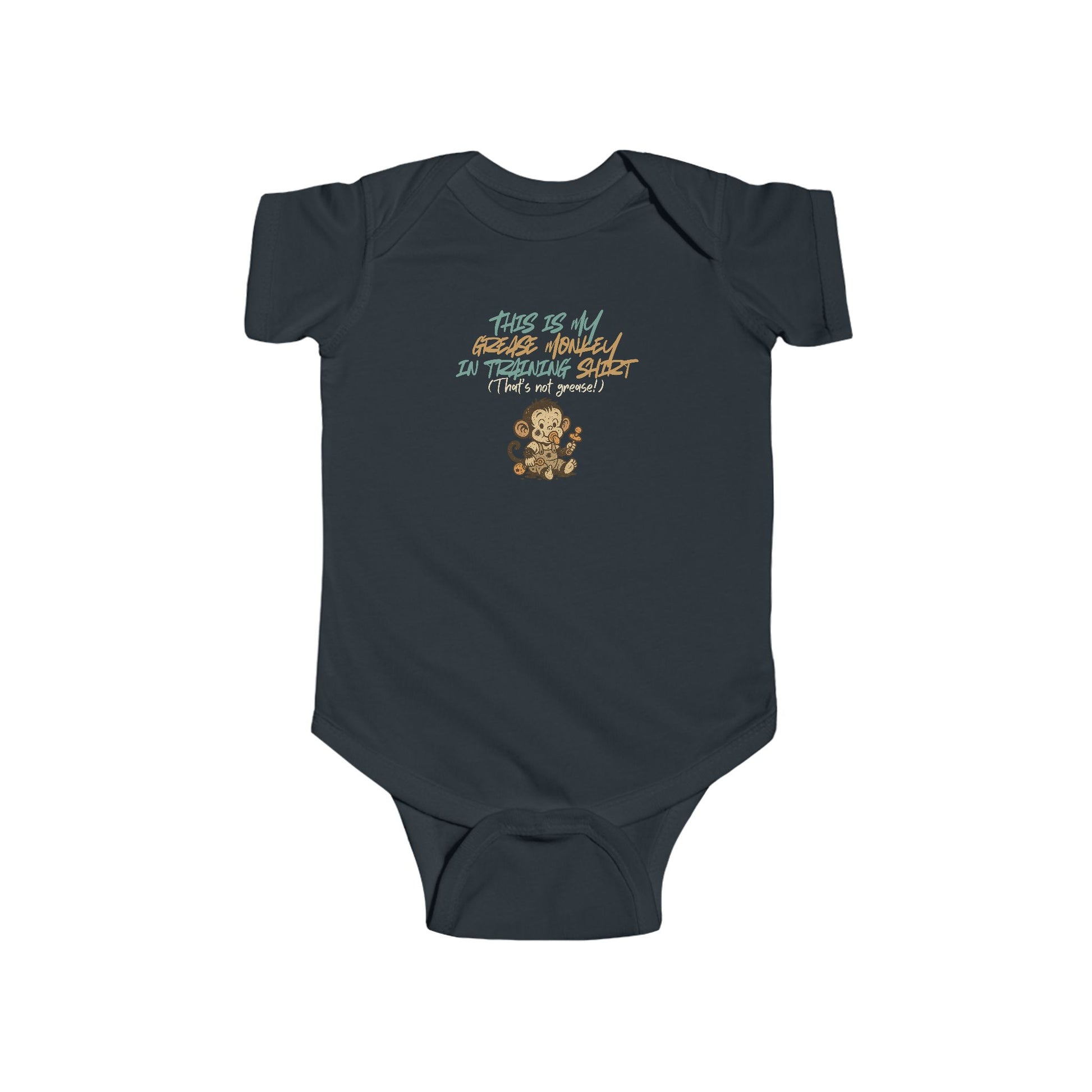 "Grease Monkey in Training" Baby Bodysuit. Funny infant one-piece with Monkey design Mechanic in training